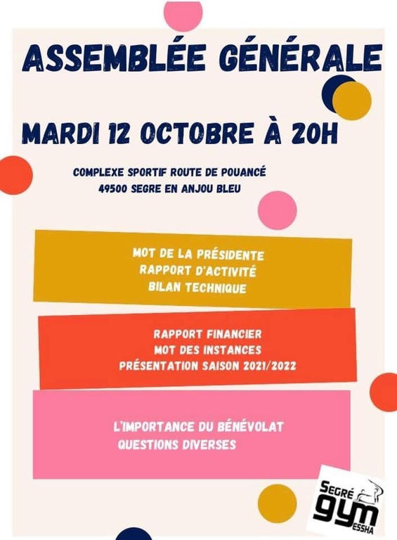 Tous les adhérents du club sont conviés à l’assemblée générale annuelle du club qui se déroulera le mardi 12 octobre à 20h à la salle de gymnastique.